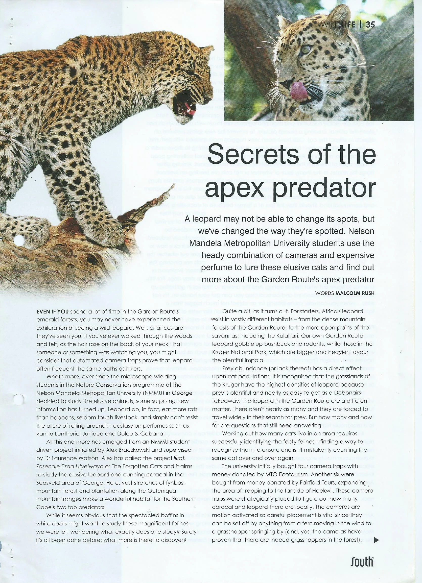Malcolm Rush from South magazine profiles the diet and prey preference work we implemented in the George-Wilderness Complex in this winter edition of the magazine. The article details the challenges of performing research in an Afrotemperate forest environment and examines the camera-trap, faecal analysis and laboratory-based work we did over a three year period between 2008-2010. Importantly, the piece also highlights the need for applied research and communication with the people who have to live alongside leopards. Luckily in George, there is little evidence to suggest leopards conflict with people and the farmer community largely corroborates this view.