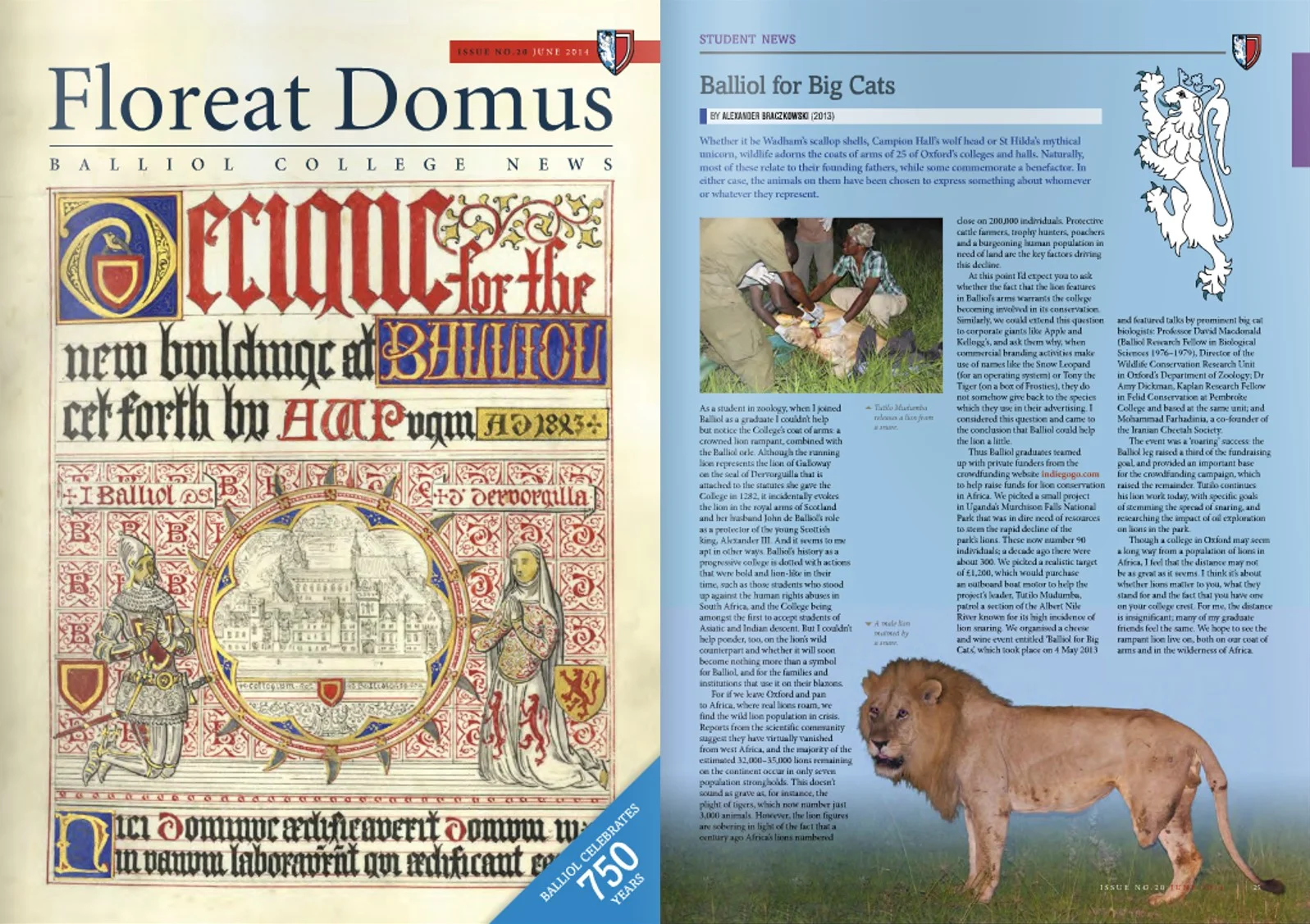 In late 2013 over 100 Oxford University students gathered at Balliol College's Hollywell Manor to hear about some of the biggest threats facing big cats around the world. They did it because they recognized the value of the rampant lion on Balliol's College shield. Collectively and together with an online Indiegogo crowd funding campaign they also raised nearly $ 3000 to help a lion conservation project in Uganda's Murchison Falls National Park. This article discusses the concept of Balliol for Big Cats and how one Oxford College did its small bit for the conservation of the animal on its crest through a daring and innovative lion project in Uganda.